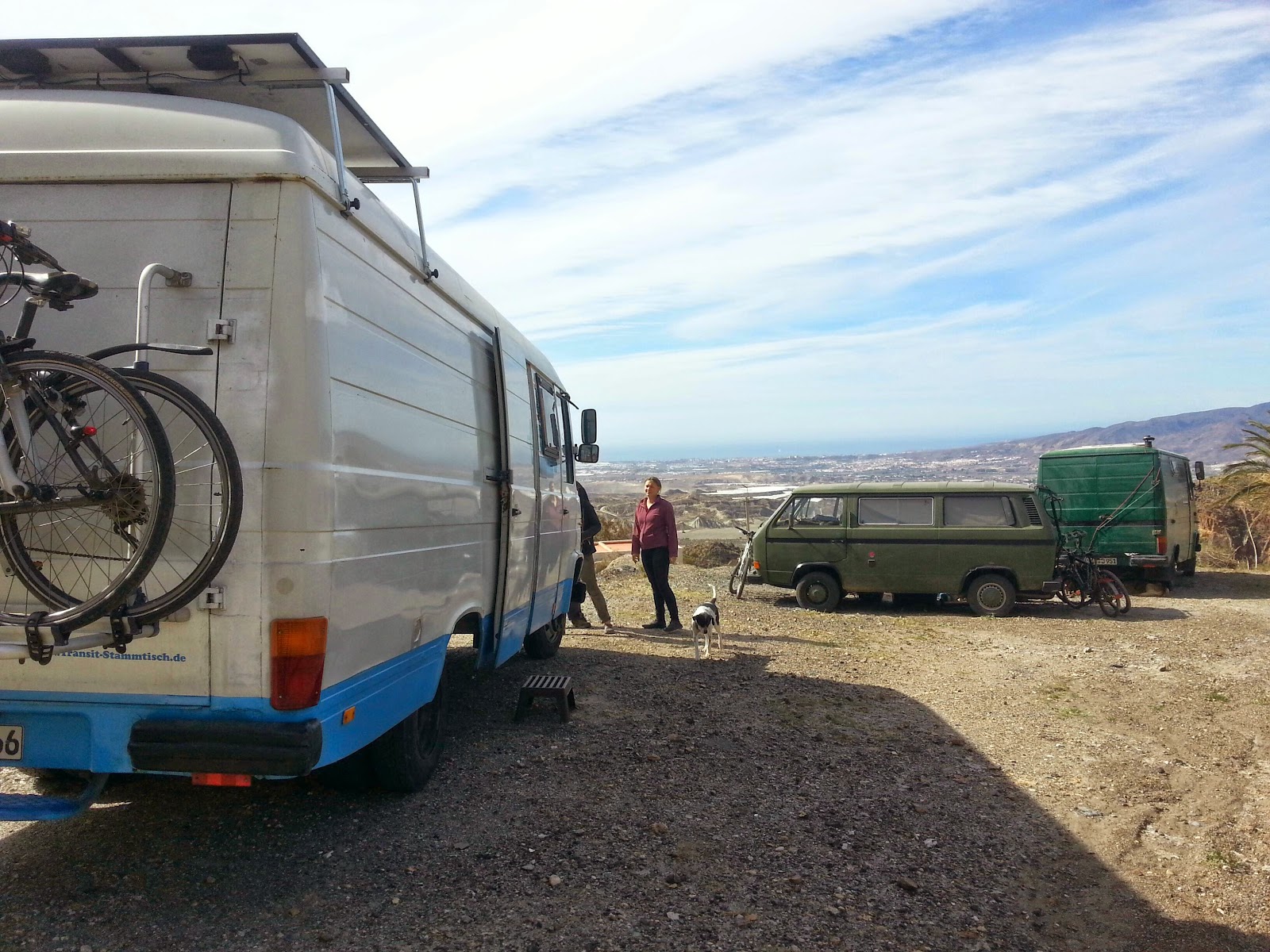 Vorgestern standen wir durch Zufall auf einem schönen Platz am Meer. Leider konnten wir das nicht so richtig nutzen da wir erst spät ankamen und der Wind kalt und stark war. Am Morgen sind wir dann in die Wüste Sierra Alhamilla gefahren. Nancy hatte aus der Karte eine heiße Quelle rausgesucht. Wir dachten vielleicht können wir mit den Kindern da baden gehen. Auf dem Weg dahin machte immer mal die Kupplung am dicken schlapp. Mir war das am Tag vorher schon aufgefallen und ich habe mich vorsichtshalber schon mal durch meine digitalen Düdo Dokumente gelesen. Die hatte ich nämlich unterwegs von dem Pärchen aus Leipzig bekommen. Erst hatten wir den Plan die Kupplung selber zu entlüften. Da wir aber so gute Erfahrungen mit einer Werkstatt machen konnten (Auspuff) haben wir beschlossen wieder eine aufzusuchen.