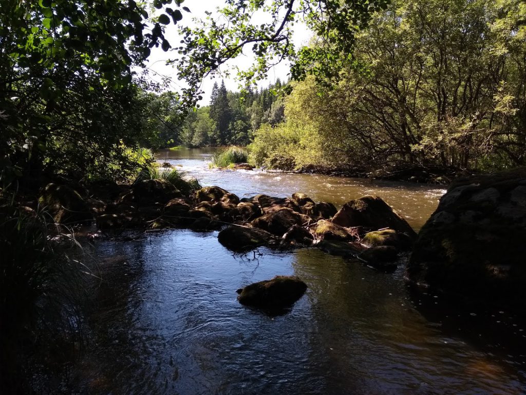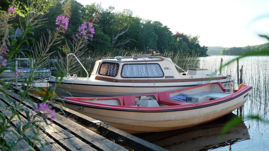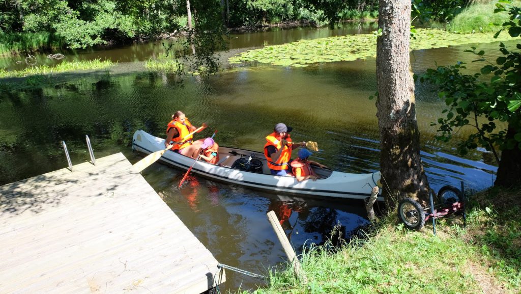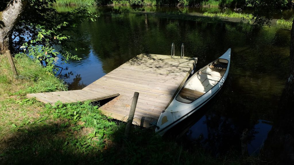 Nach unserem letzen Post folgte noch eine weitere Nacht an einem See in der Nähe von Boras. Nach dem wir dann noch ausreichend shoppen waren, in Schwedens Baumarkt/Handwerker/Outdoor Shopketten, ging es auf einen Stellplatz an einen Fluß bei Hillared. Mini kleiner Stellplatz Hinweisschilder bestätigten uns, dass wir richtig fuhren. Dann standen wir zwischen Privatgrundstücken und waren kurz verwirrt. Nach kurzer Suche eröffnete sich uns dann ein wahres Idyll. Ein kleiner Platz direkt am Flußufer mit allem was man braucht. Sogar mit kleiner vollständiger Küche, Bootshaus, Festzelt, Sauna usw. Kein Mensch da, aber alles offen und frei verfügbar. Vor uns lag das Ufer mit Sitzbänken und Seerosen überzogenem Wasser. Wahnsinn! Hier blieben wir also gleich zwei Tage. Am ersten Morgen tauchten dann mal Nachbarn auf und erklärten uns, dass die Besitzer im Urlaub sind aber diese jetzt wieder kommen.