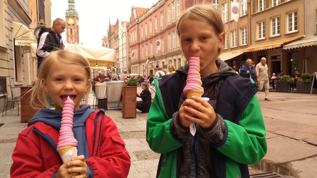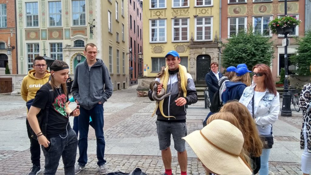 Das Wetter war endlich etwas aufgelockert. Den Düdo konnten wir an einem kleinen Jachthafen parken, an dem auch die Polizeiboote angedockt sind. Ins Altstadtzentrum waren es nur wenige Minuten. Mit den Sportrollern, jeder ein Kind vorne drauf, ging es zur Erkundungstour durch die Stadt. Unterwegs gab es ein riesen Softeis. Die Altstadt ist sehr schön und sehenswert, aber überschaubar. So, dass wir schnell den Eindruck hatten, alles gesehen zu haben. Neben den üblichen Straßenkünstlern, konnten wir auch Schlangen in der Fußgängerzone bestaunen.
