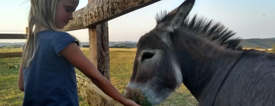 Nach Ankunft auf dem Eselhof wurden erst mal ausgiebig Esel gekuschelt und die restlichen Bauernhoftiere, wir Schafe, Hasen, Hühner, Schweine und ein Lama angeschaut. Außerdem durften wir zweimal zuschauen, wie die Esel gemolken werden. Die Milch wird hier auf der Farm für Kosmetikprodukte wie z.B. Seife verwendet. Wir haben uns natürlich auch jeder eine Seife aus der Eigenproduktion der Farm mitgenommen. Zum Abendbrot haben wir uns eine Platte mit regionalen Wurstprodukten bestellt und vor dem Lindbuzzz mit herrlicher Aussicht gegessen. Am nächsten Morgen gleich um 9.00 Uhr haben wir uns für eine Stunde einen Esel „gemietet“. Mit diesem kann man dann spazieren gehen und die Kinder dürfen auf ihm reiten….