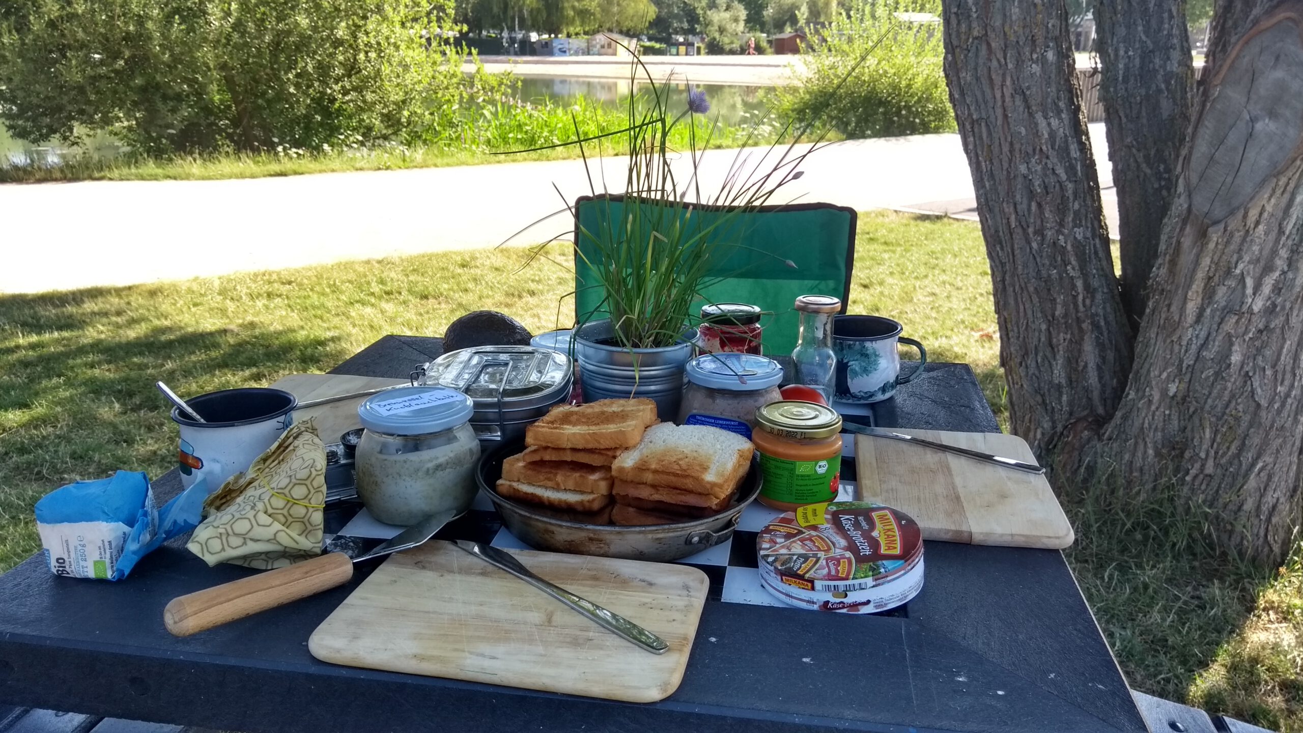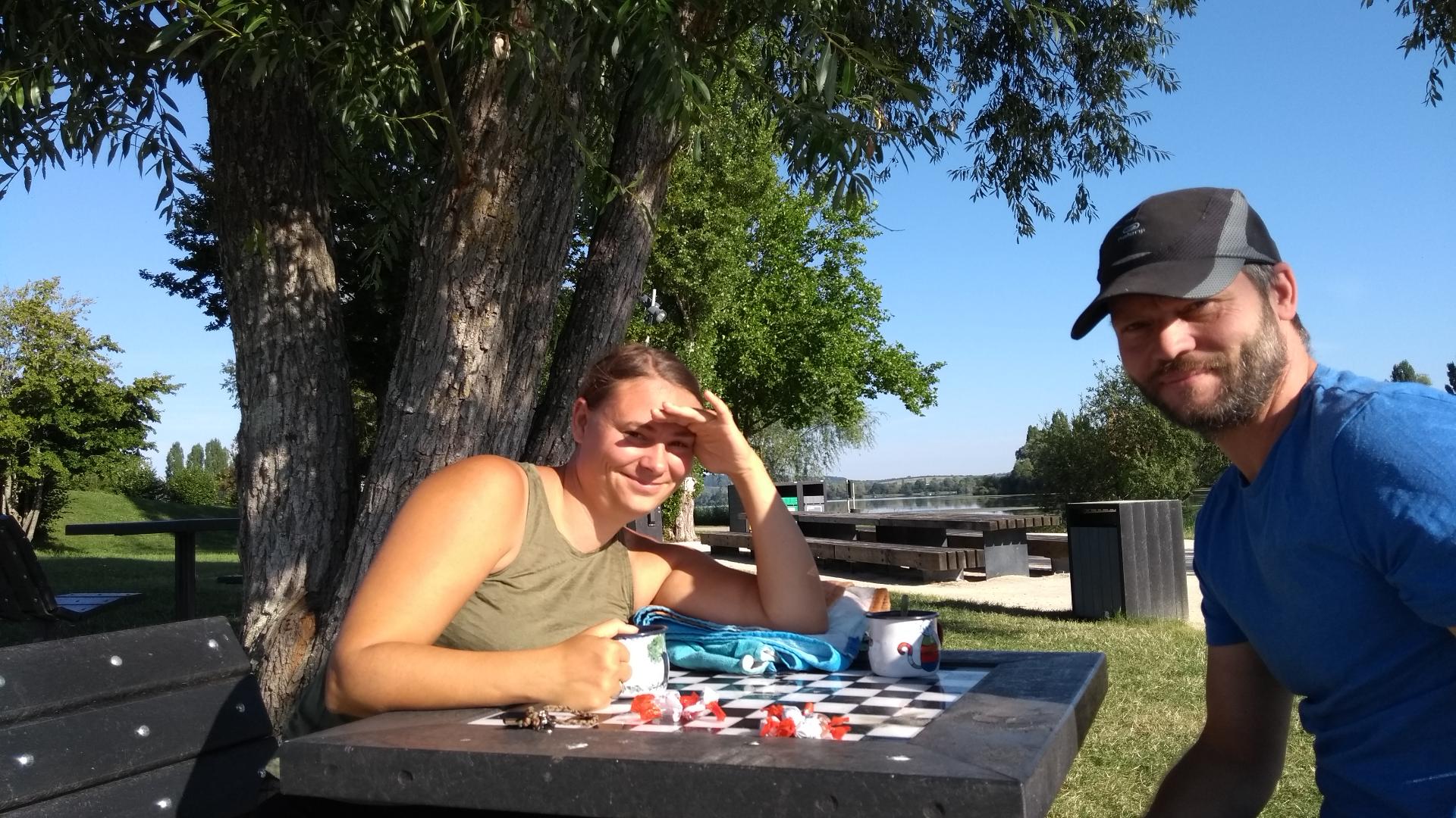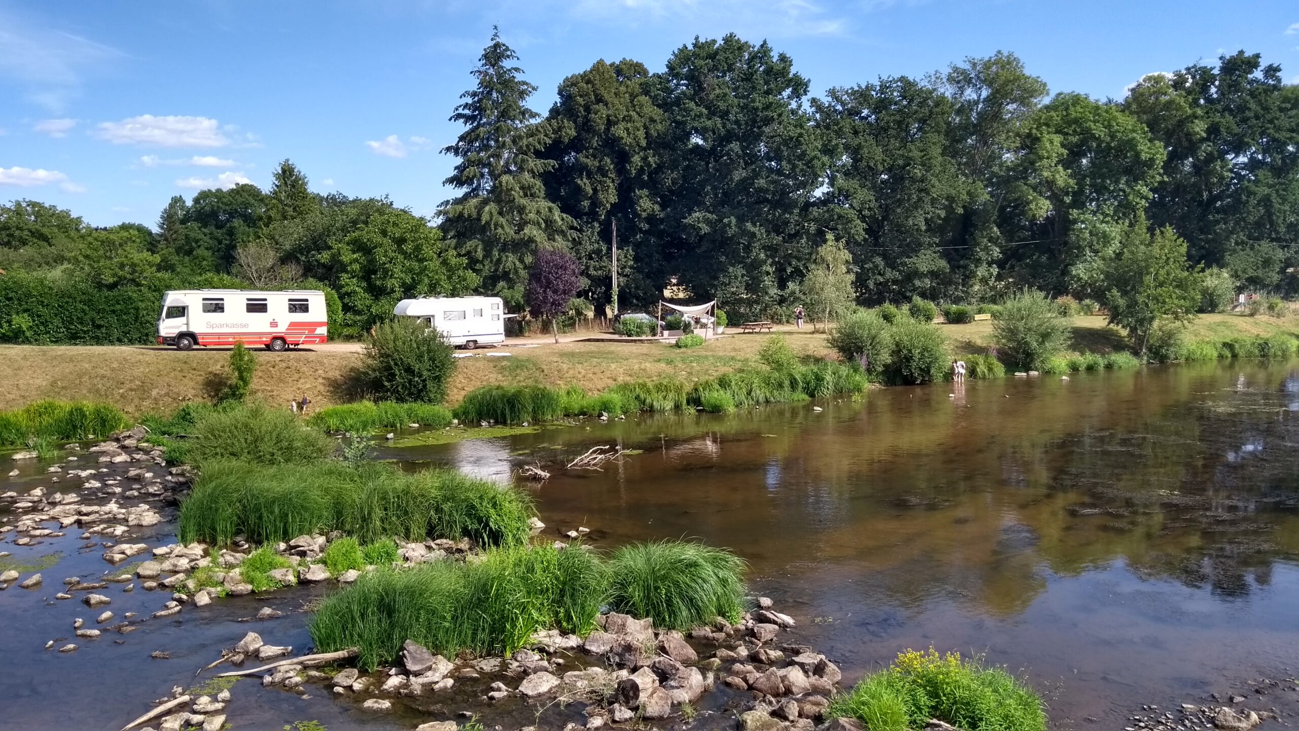 Heute Morgen, beim Frühstück am See, mussten wir dann feststellen, dass neben uns auch noch ein Freibad ist. Schnell war klar, dass wir da nochmal rein müssen. Für 14€ für uns vier, war der Besuch auch für eine Stunde okay. Anschließend mussten wir uns beeilen um bei einem örtlichen Bäcker eine „to good to go“ Bestellung abholen. Diese App haben wir auch schon oft zu Hause benutzt. Man kann für kleines Geld Lebensmittel, kurz vor Ladenschluss, vor der Tonne retten. Mit dem ersten Versuch in Frankreich sind wir sehr zufrieden.
