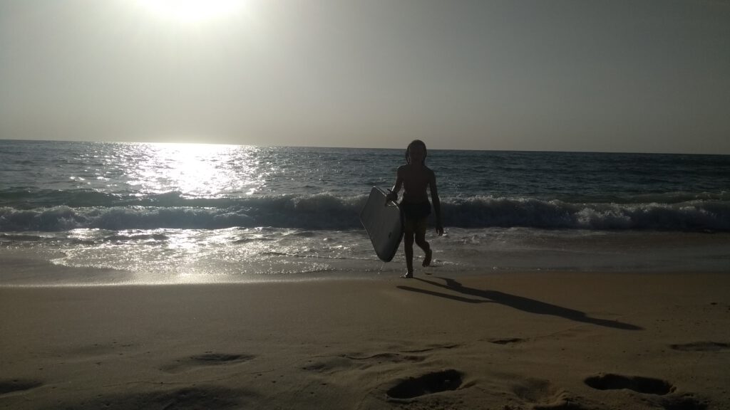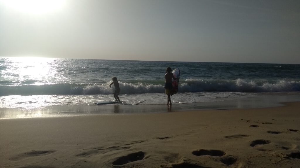 Kaum angekommen ging es mit den Rollern bis an den Strand. Dort trafen wir auf eine riesen Strandpromenade mit Bars, Läden und Restaurants. Zum Glück war es schon später und der Strand schon etwas ruhiger. Bis 20.30 Uhr hatten wir Vier eine Menge Spaß in den Wellen. Die Kinder haben neue Surfboards und konnten die gut testen. Es war für sie eine ganz neue Erfahrung, welche Kraft und Wucht der Atlantik hat.