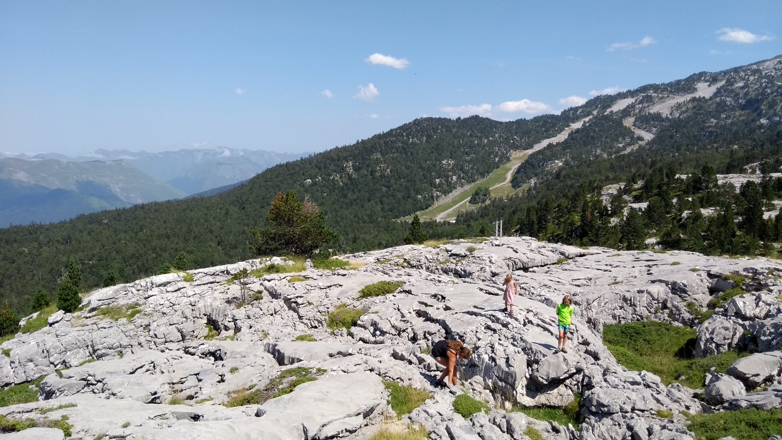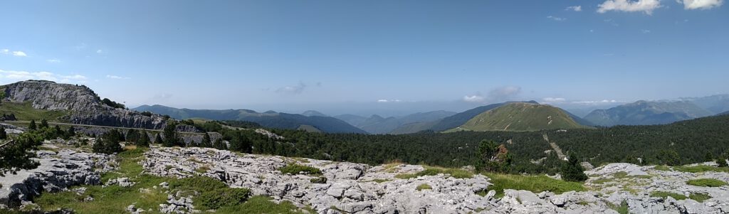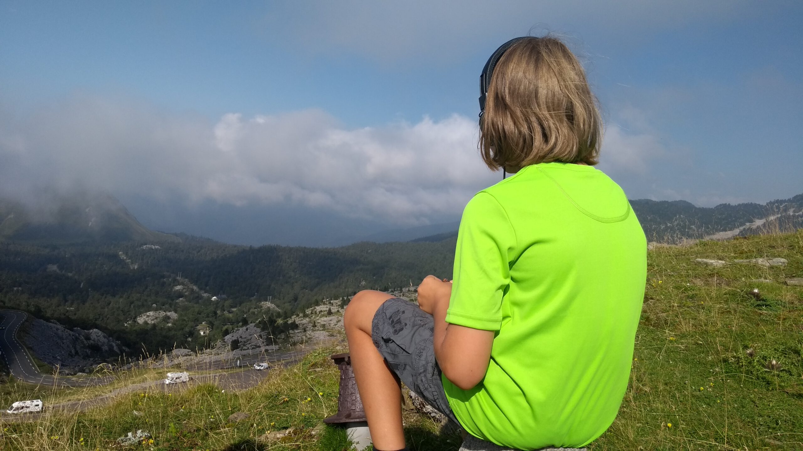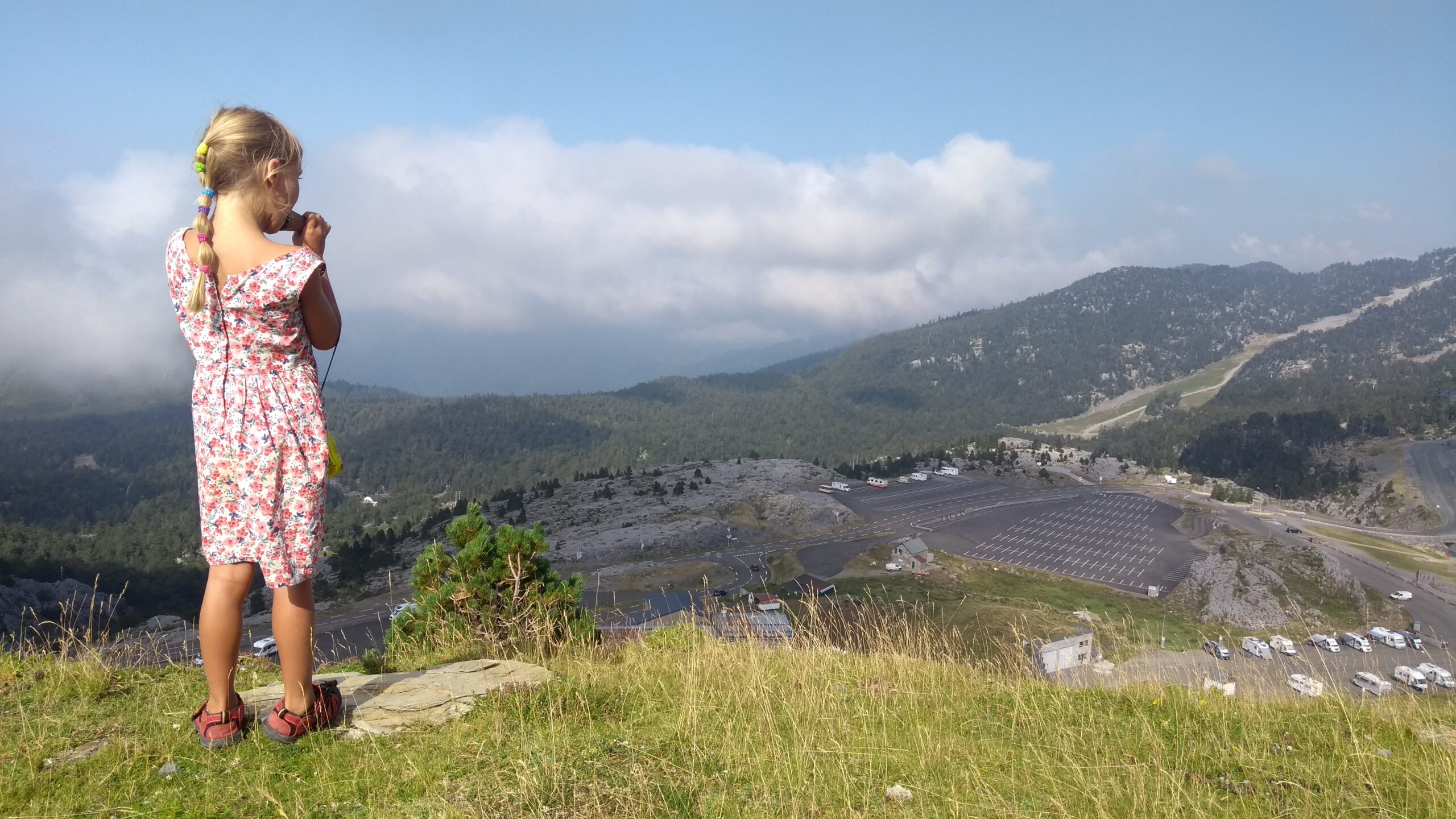 Vom Tal mit Bachlauf ging es Vorgestern weiter durch die Berge. Auf einem Gipfel mit Skilift bei 1700m haben wir uns auf einen großen Parkplatz gestellt. Wir hatten eine herrliche Aussicht über die umliegenden Berge. Sogar einen Adler haben wir fliegen gesehen. Rundherum liefen viele frei Tiere. Es gab Pferde, Kühe, Schafe, Hühner und sogar Schweine. Wir haben zugeschaut, wie die Kühe selbstständig zur Melkanlage laufen. Außerdem sind wir auf einen kleinen Berggipfel gestiegen und auf den umliegenden Felsen rumgekraxelt.