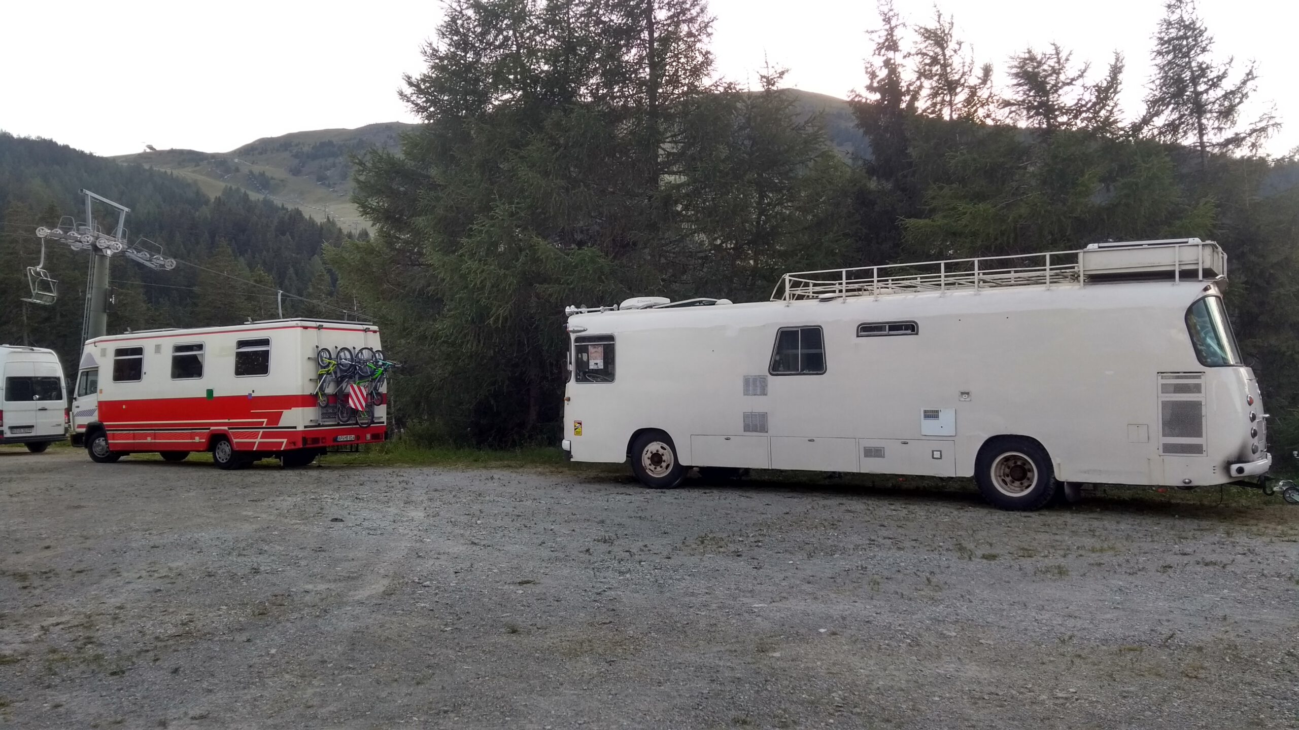 Nun stehen wir auf dem Katschberg, ca. 100 km vor Slowenien und genießen eine Pizza. Den Aufstieg musste sich der Lindbuzz mit 17 kmh hart erkämpfen. Dafür darf er jetzt neben einem 60 Jahre alten Mercedes Bus verschnaufen.