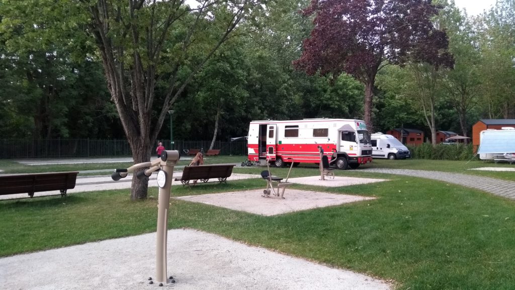 Gegen Nachmittag sind wir in Paris auf dem Campingplatz angekommen. Dort hatten wir einen Platz reserviert, trotzdem wollten sie uns nicht drauf lassen. Unsere Zeillingsreifen würden ihren Rasen kaputt fahren. Ihr Vorschlag wir bezahlen das doppelte oder stehen für den normalen Preis auf dem Schotterplatz am Eingang. Mit beidem war ich nicht einverstanden. Schlußendlich war der Kompromiss dann ein Plattenweg vorm Fitnessplatz. Das war okay.