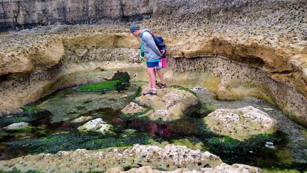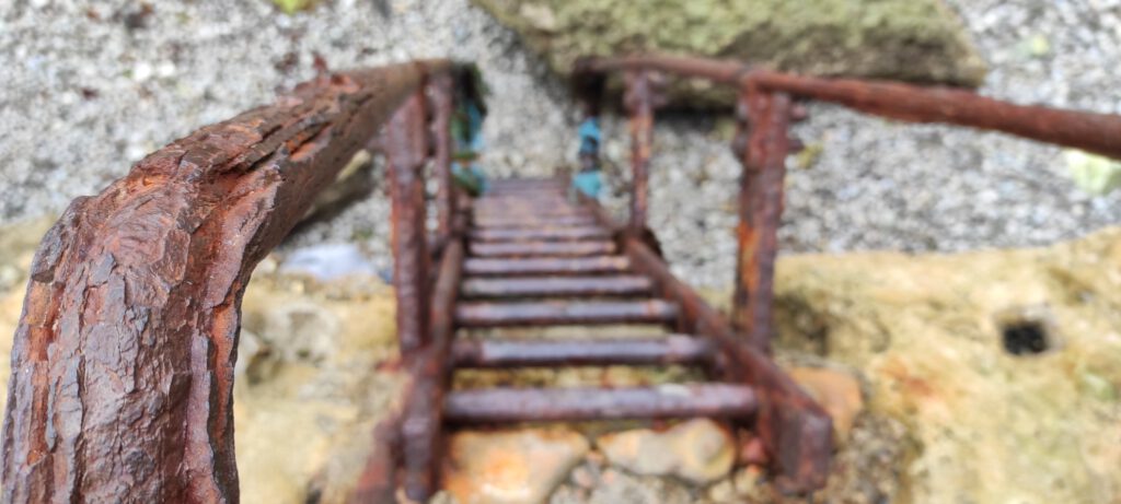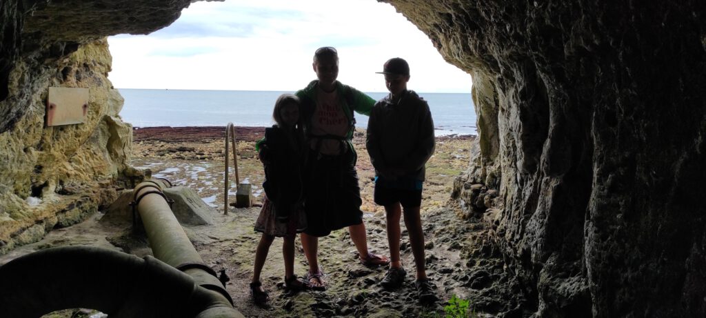 Auf dem Rückweg sind wir dann nochmal eine steile Treppe die Steilküste hinunter gestiegen. Inzwischen war wieder Ebbe und wir konnten auf Entdeckungstour gehen. Über eine rostige Leiter haben wir den Zugang zu einem alten Tunnel gefunden. Das ander Ende war nicht zu erkennen, wir sind ein ganzes Stück hinein gelaufen, dann hat uns der Mut verlassen und wir hatten alle verschiedene Ideen was gefährliches passieren könnte. Also haben wir den Rückweg angetreten.