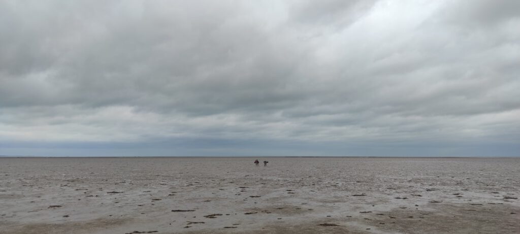 Heute sind wir zum Abschied von der Küste nochmal an den Strand westlich von Le Mont Saint Michel gefahren. Es war gerade wieder Ebbe und wir sind nochmal eine Runde durchs Watt gestapft.