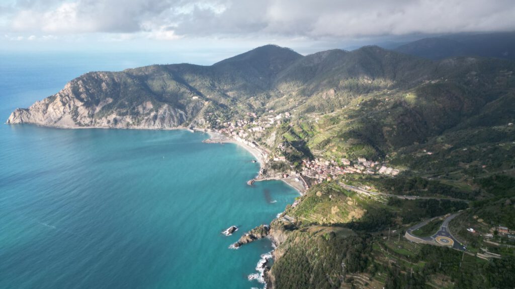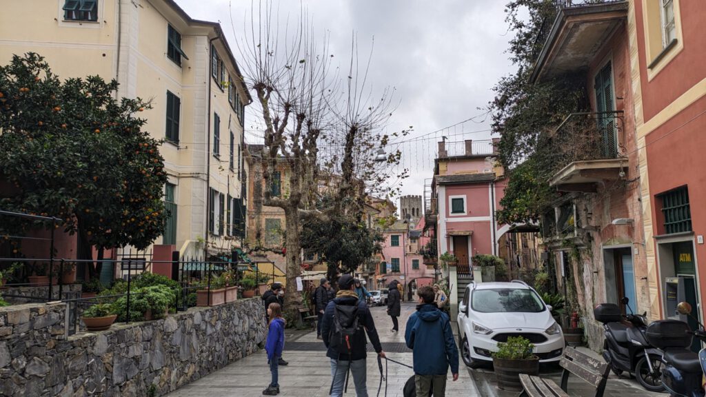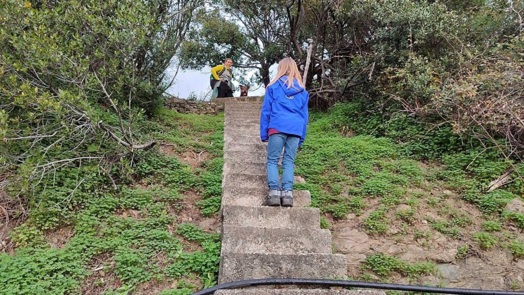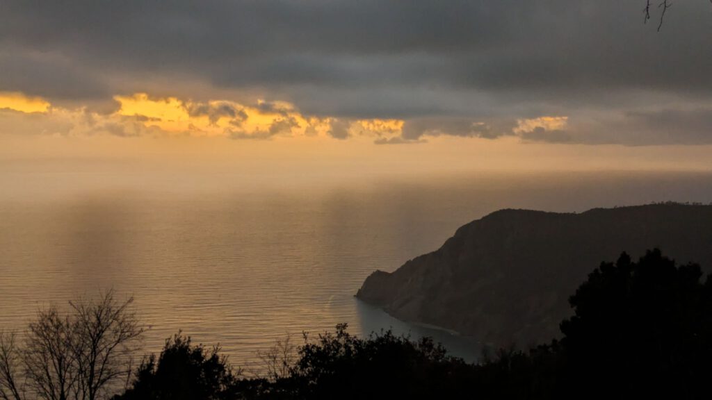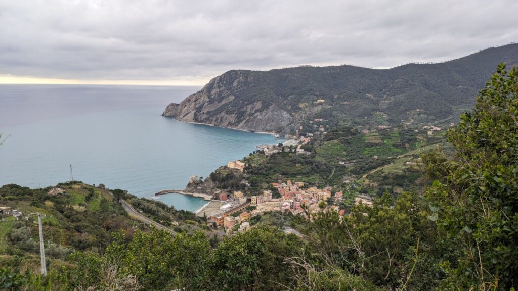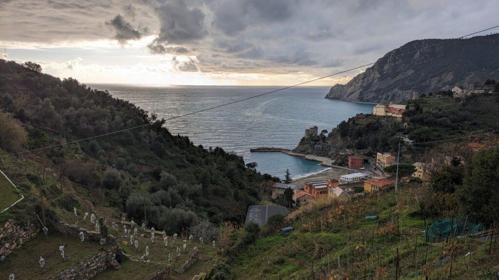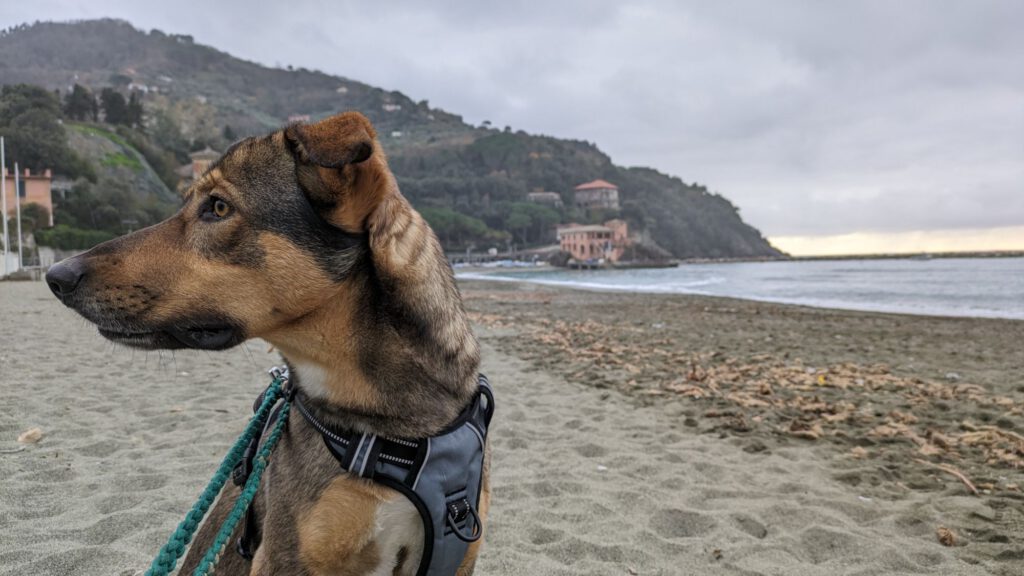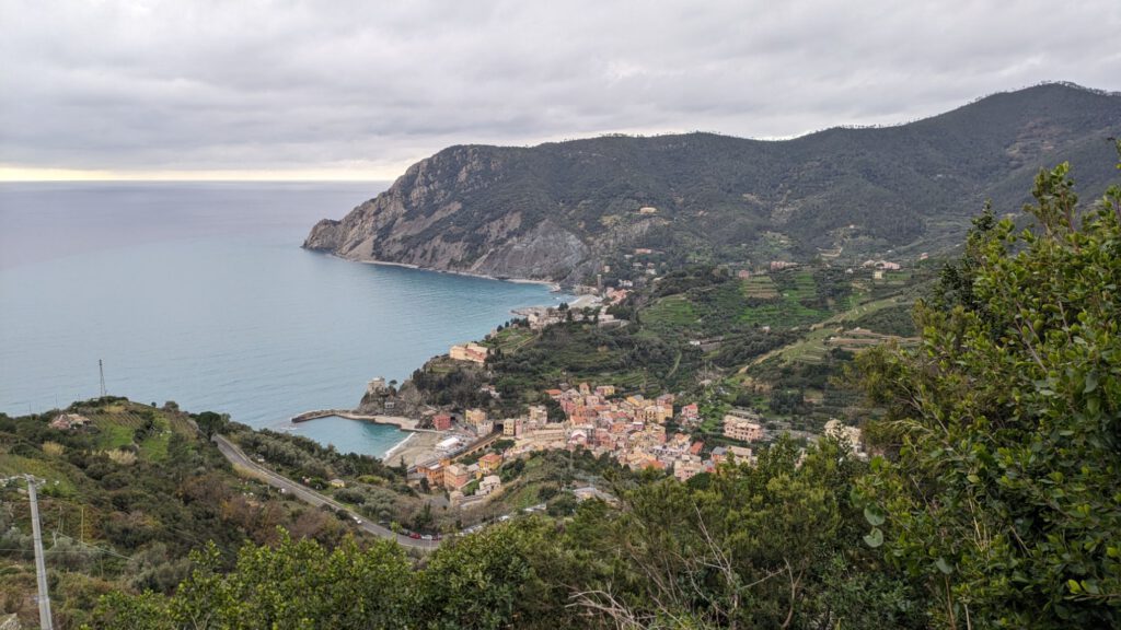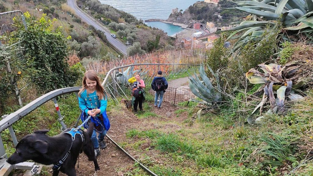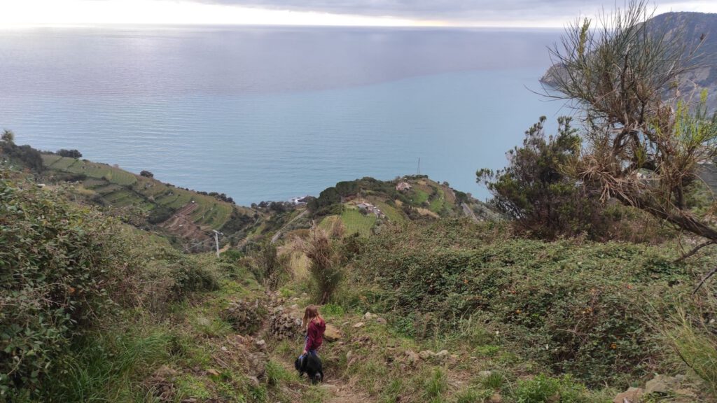 Auch diesmal wollten wir uns eins der Dörfer der Cinque Terre anschauen. So sind wir am 25. von Spotorno nach Westen in die Cinque Terre gefahren. Im Osten bei Imperia oder San Remo wäre es zwar nochmal etwas wärmer, aber dort ist es auch ziemlich überlaufen. In Levanto haben wir nochmal einen Stopp eingelegt. Da die Kinder keine Lust auf Stadtbummel hatten, sind Daniel, die Hunde und ich alleine losgezogen. Für uns gab es dann Cappuccino und für die Hunde eine Toberunde auf einem Auslaufgelände. Von Levanto ging es dann auf den Berg oberhalb von Monterosso. Hier hatten wir eine super Aussicht. Ich hatte gelesen, dass hier ein guter Startpunkt für eine Wanderung nach Monterosso ist.