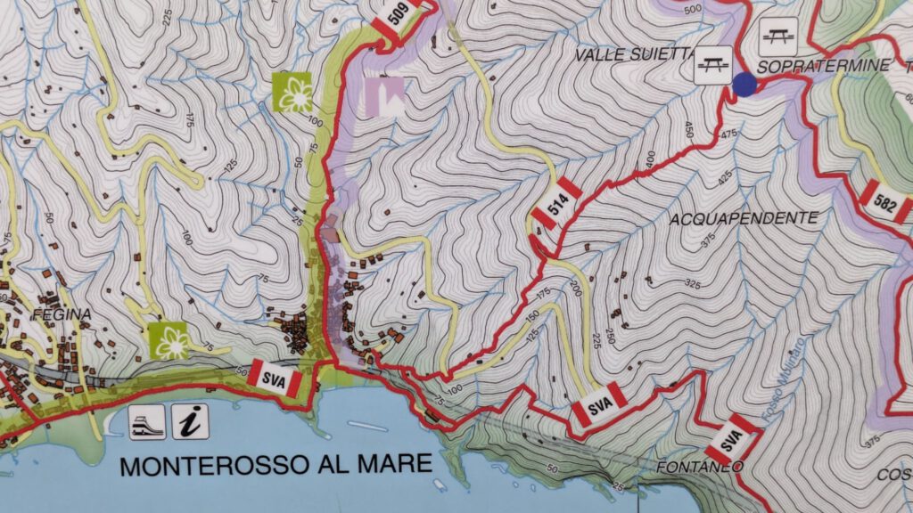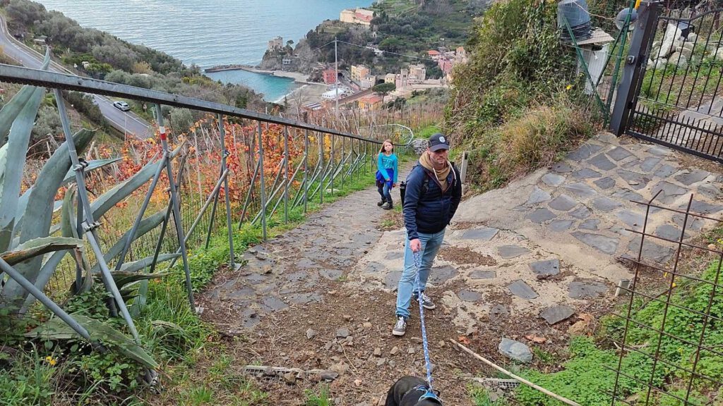 Gestern Morgen sind wir dann auf dem asphaltierten Wanderweg nach unten gestartet. Schnell wurde klar, dass die Definition „Wanderweg“ nicht ganz unseren Vorstellungen entsprach. Es ging einfach nur super steil bergab, meist auf steinigen, erdigen Trampelfaden. Zwischendurch gab es auch Abschnitte mit rutschigen Felsen. So quälten wir uns 1,5 Stunden mit zittrigen Beinen stetig bergab. Irgendwann hatten wir Monterosso erreicht. Richtig genießen konnten wir es nicht, da der stetige Gedanke an den bevorstehenden Aufstieg da war.
