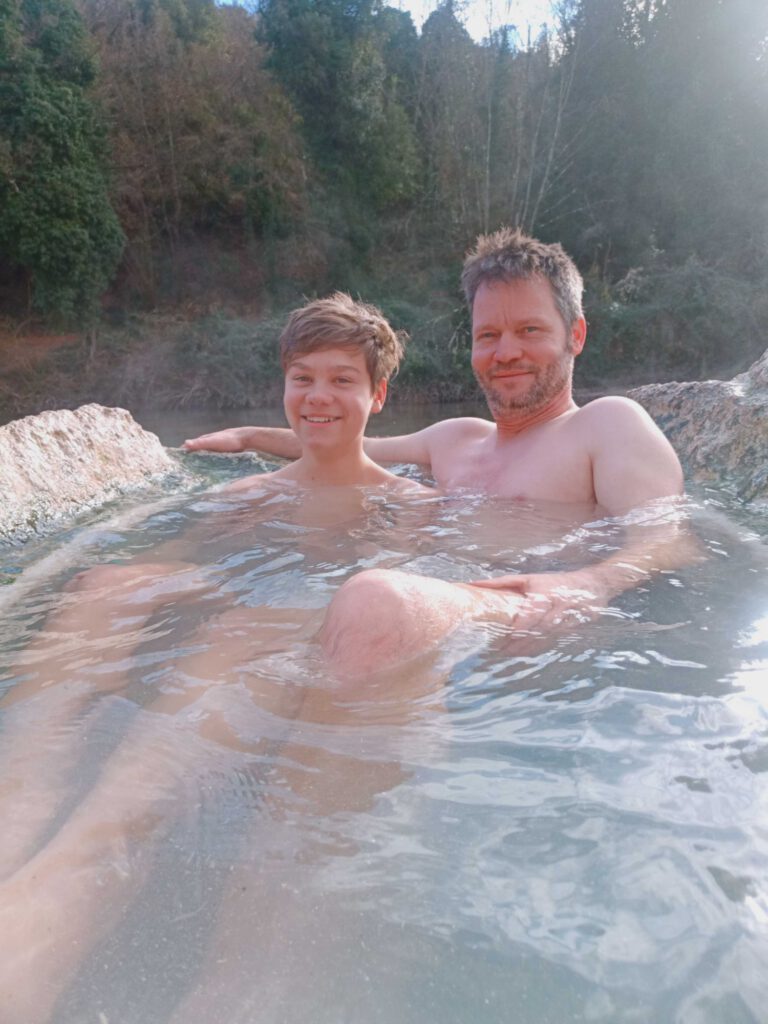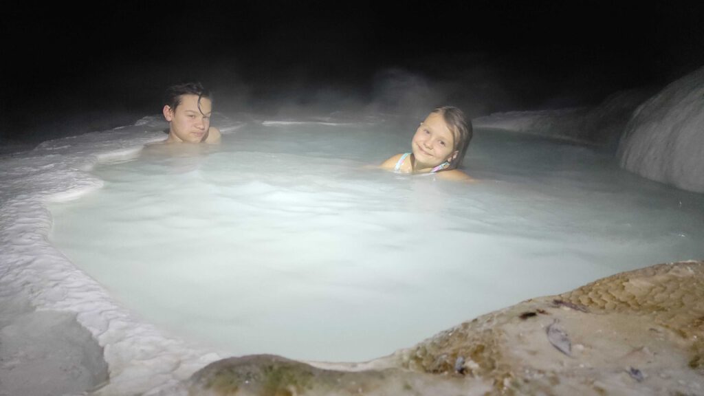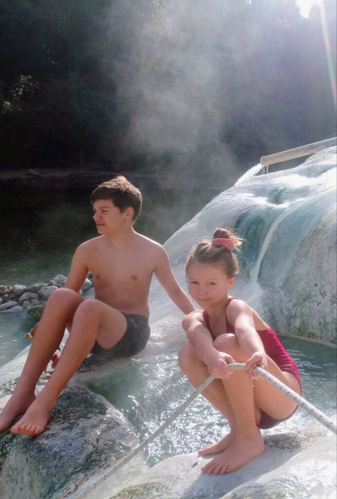 Von Pisa ging es gestern nochmal ein ganz schönes Stück in den Süden. Unser Ziel, die heißen Quellen von Petriolo, südlich von Siena. Hier haben es sich schon die Römer gut gehen lassen. Am frühen Abend kamen wir an und gönnten uns gleich ein warmes Bad, bei 10c° Außentemperatur. Das tat super gut! Danach kämpften Leila und ich zwar ganz schön, auf Grund des hohen Mineraliengehaltes, mit unseren Haaren, aber das war es wert.