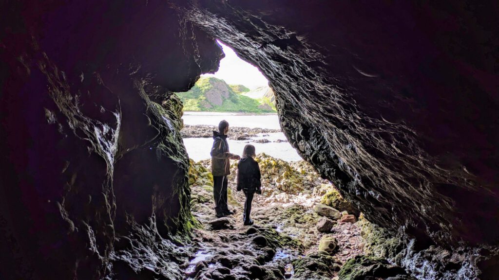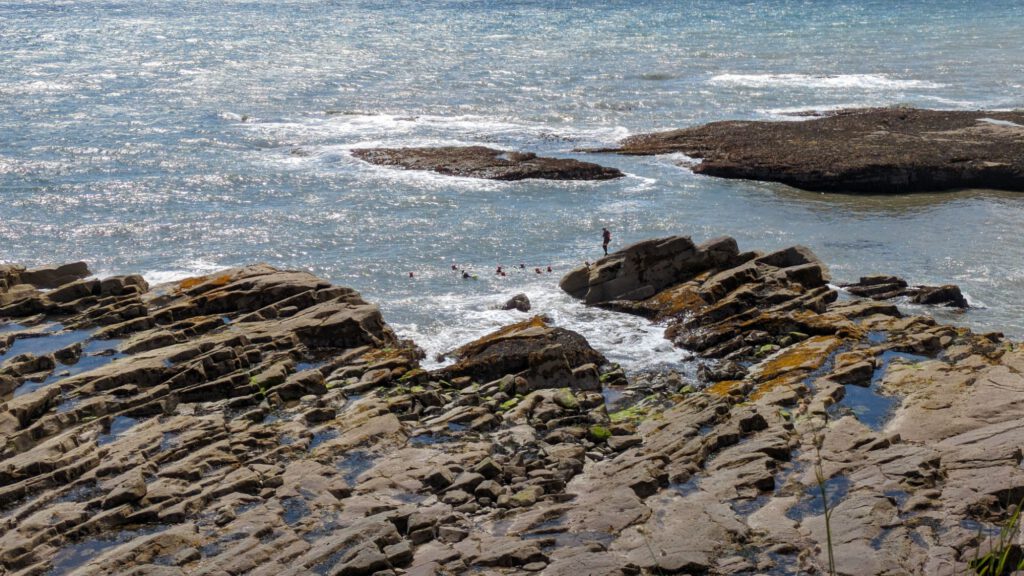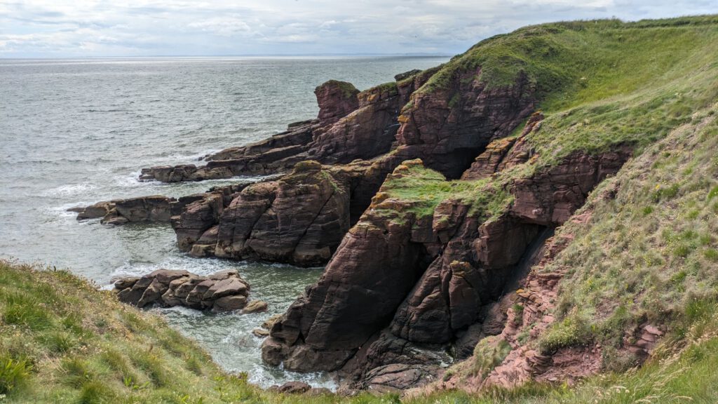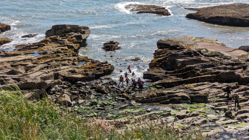 Anschließend ging es die Arbroath Cliffs entlang. Außer uns war unter anderem auch eine Schülergruppe da, die mit Neoprenanzug und Schutzausrüstung mit Guide durch die Felsen schwammen.
