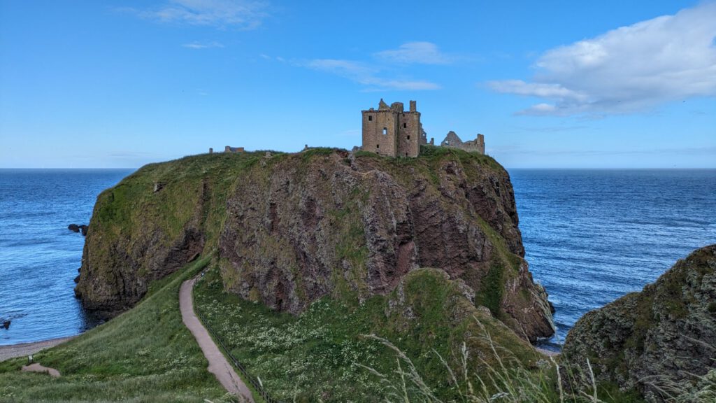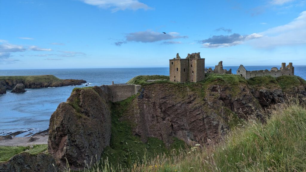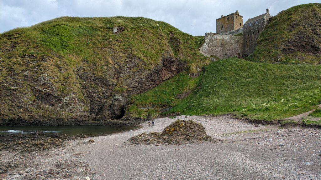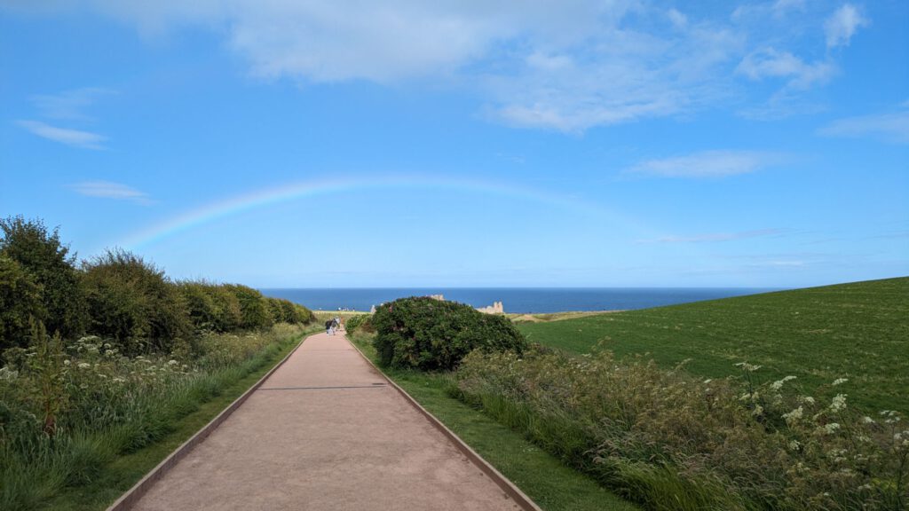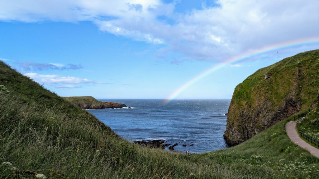 Von Arbroath ging es am späten Nachmittag nochmal ein kleines Stück weiter an das Dunnotter Castle. Als wir ankamen, gab es gerade einen Regenbogen darüber.