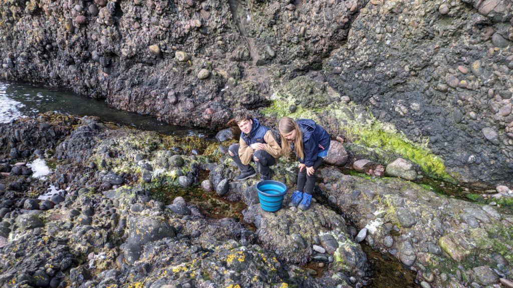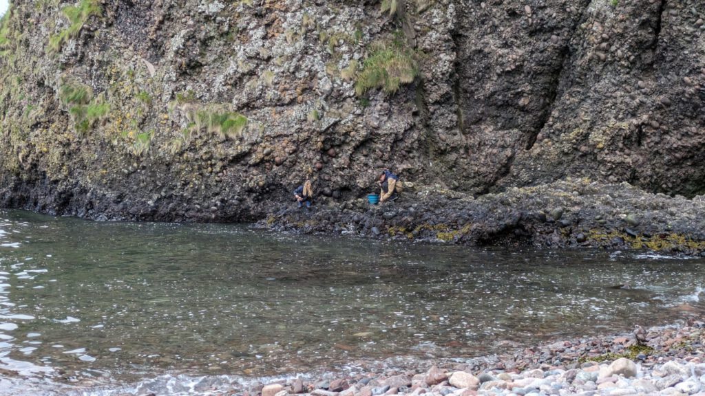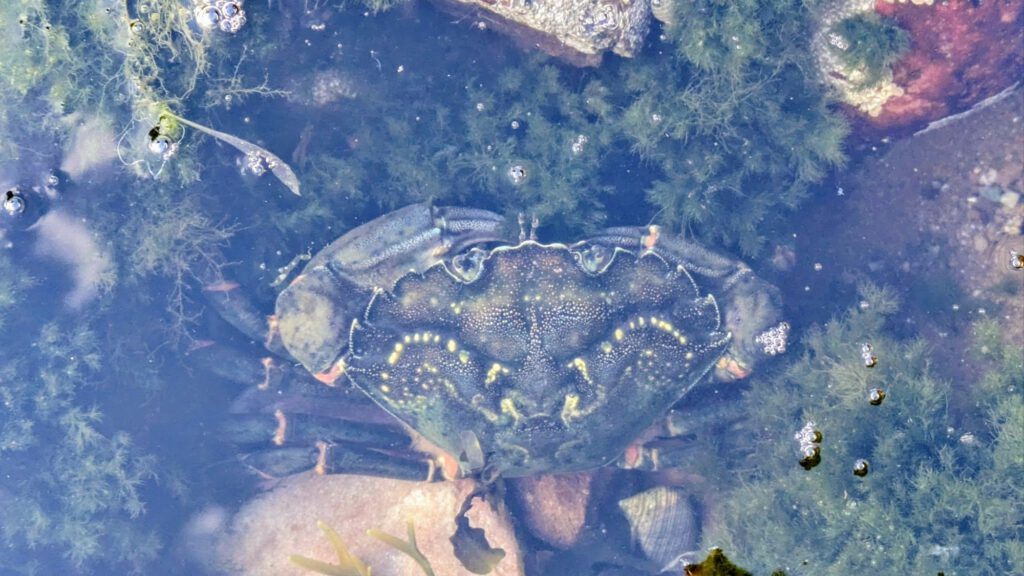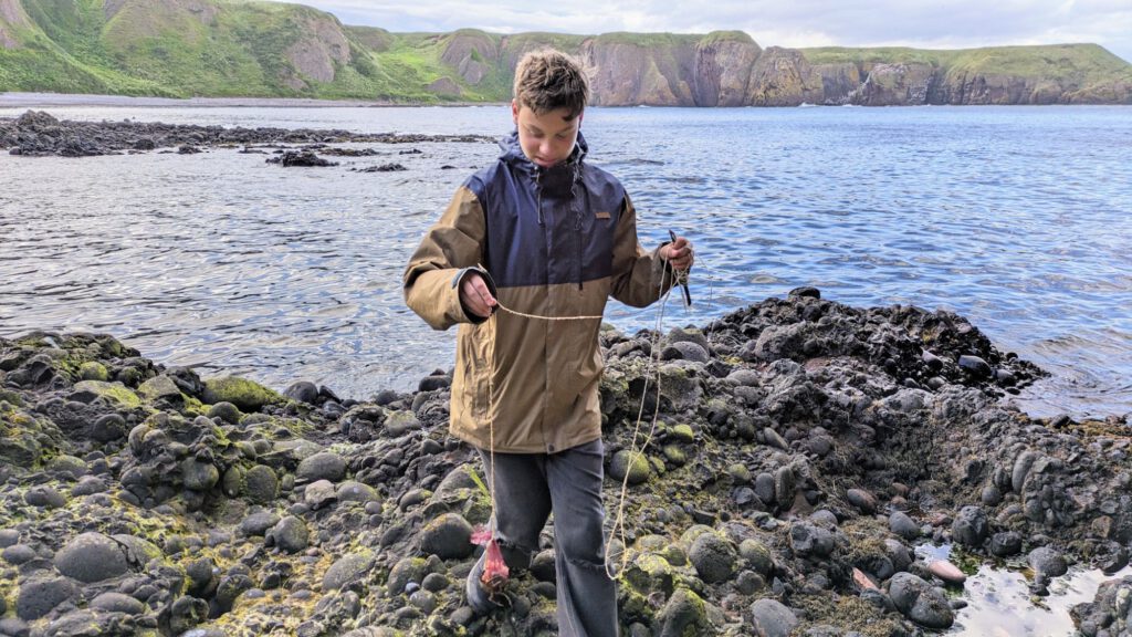 Nach einem kleinen Rundgang wurden wieder Angeln gepackt. Diesmal selbstgebaute Krabbenangeln. Es dauerte nicht lange und zahlreiche Krabben bissen sich mit ihren Scherren fest. Die Kinder haben sie dann in kleine Becken, in den Felsen, gesetzt.