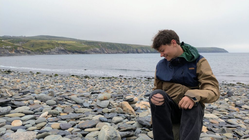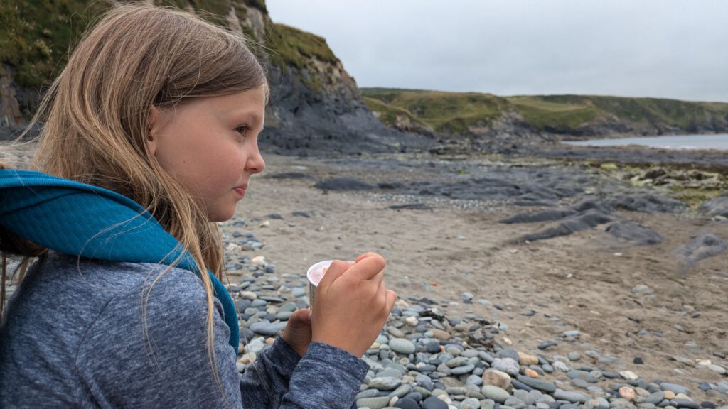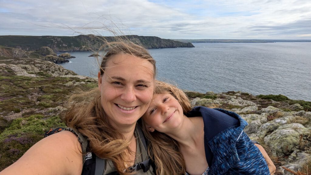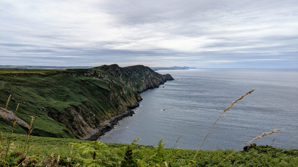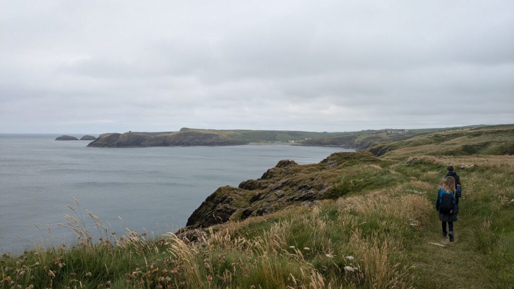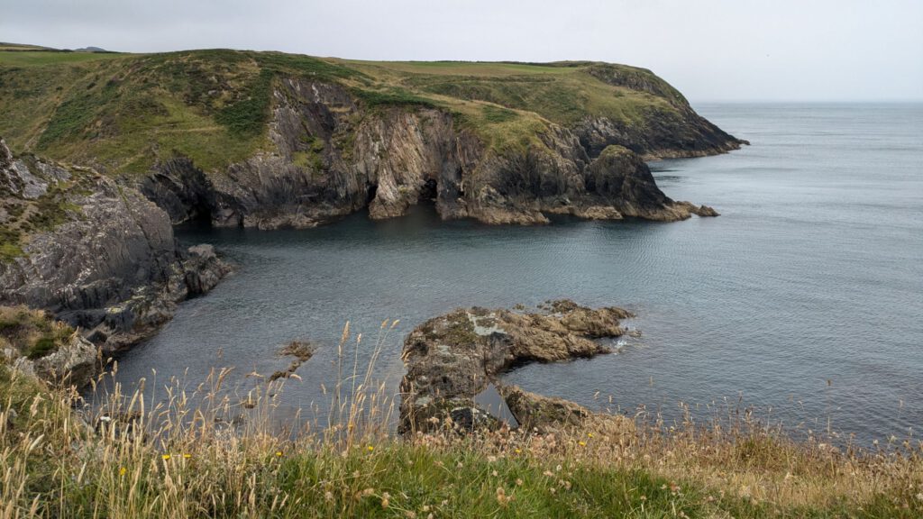 Von diesem ruhigen Idyll ging es dann wieder an die Küste. Als erstes zum Lebensmittel auffüllen und dann an die Steilküste, an die Carreg Onnen Bay. Um dort hin zu gelangen sind wir mal wieder lange endlose einspurige Straßen gefahren. Die Waliser haben sich dabei auch gleich noch die Ausweichbuchten gespart. Ging aber irgendwie und wir waren dann auch nicht die Einzigen auf dem Wanderparkplatz mit Wohnmobil. Leila und ich sind gleich nochmal ein Stück den Küstenweg entlang gewandert.