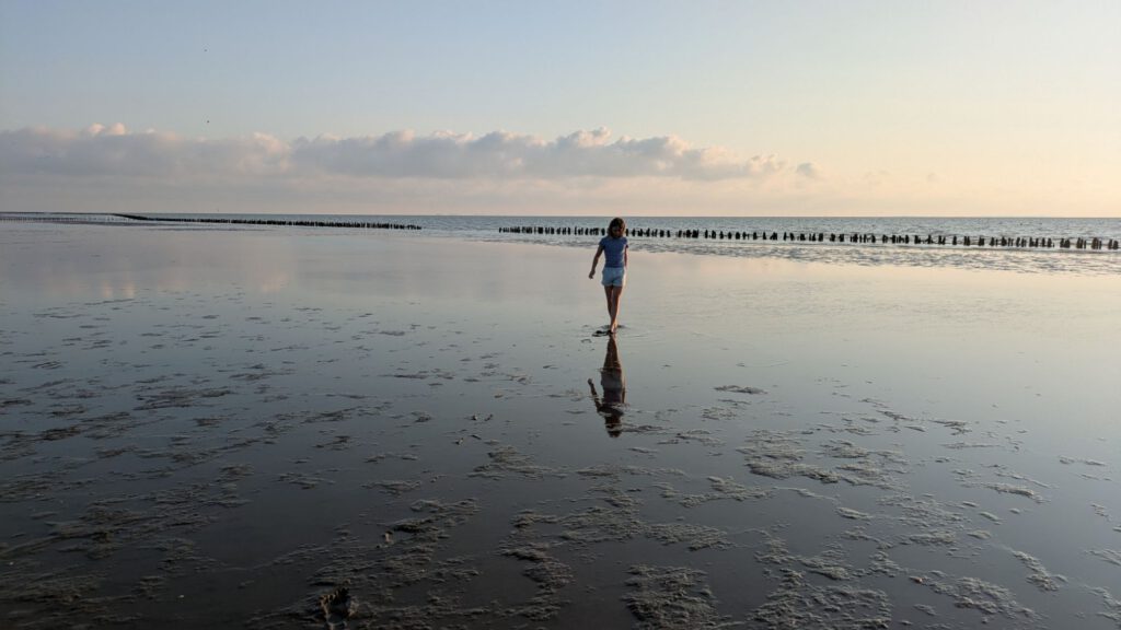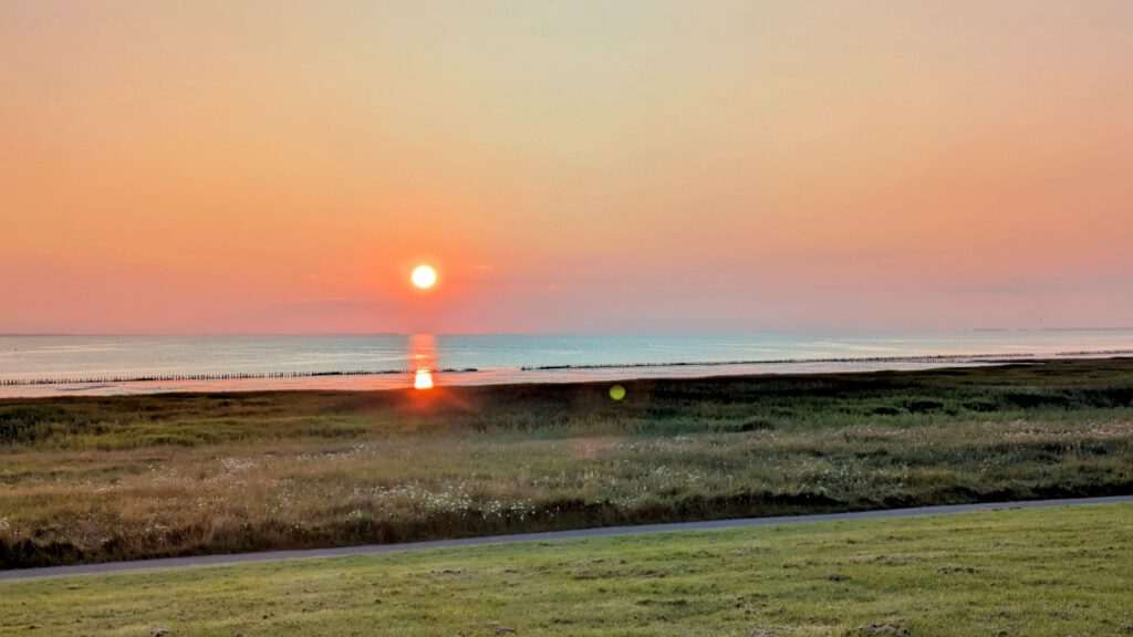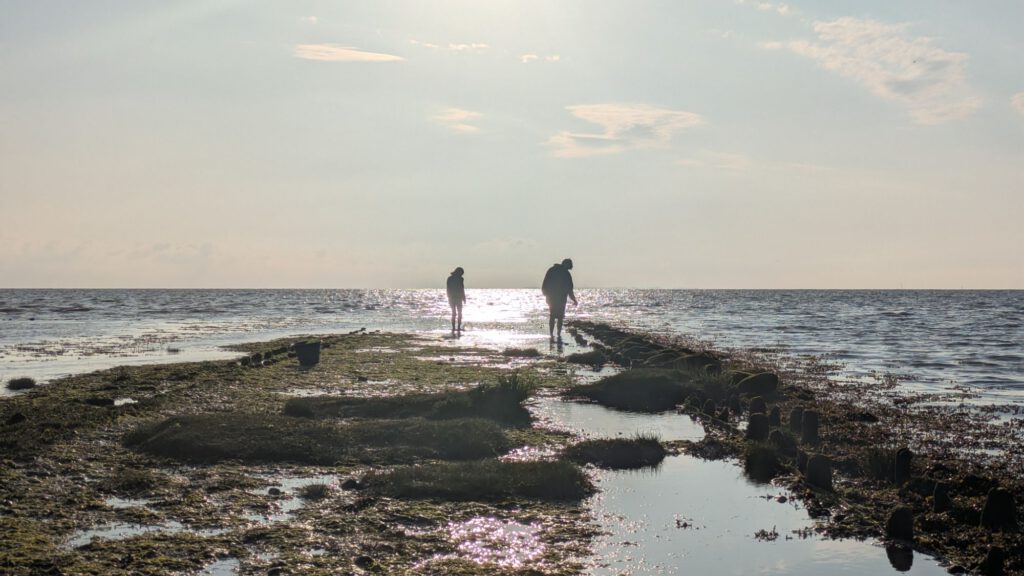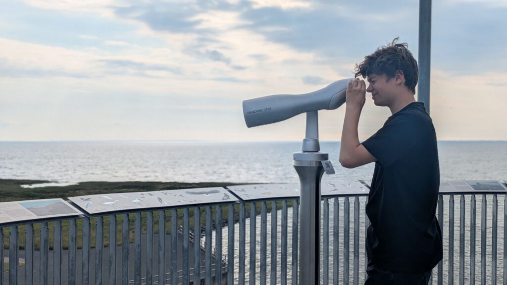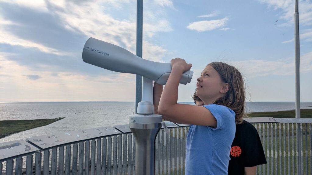 Gleich hinter der Grenze sind wir einen Platz am Meer angefahren. Hier gab es einen Aussichtsturm, viele Vögel, Krabben, Watt zum erkunden und einen tollen Sonnenuntergang.