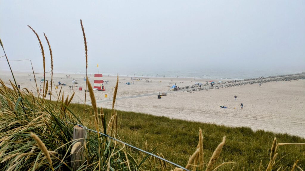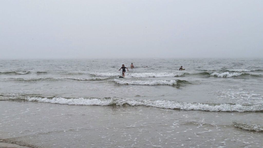 Bei Ankunft waren wir unter einer dicken Nebelglocke, die die Sicht stark eingeschränkt hat. Da es trotzdem warm war sind wir als erstes in die leichten Wellen gesprungen.