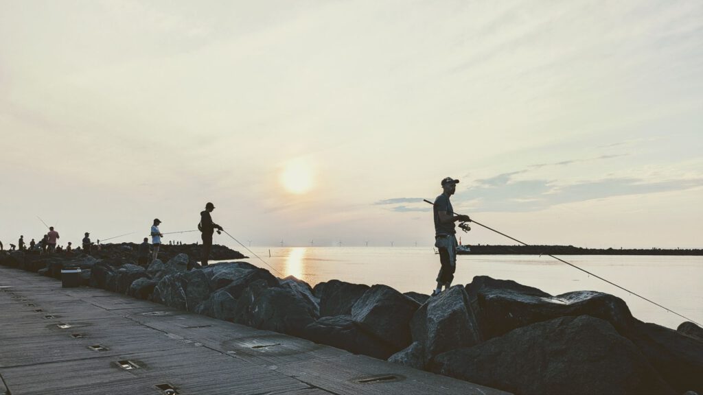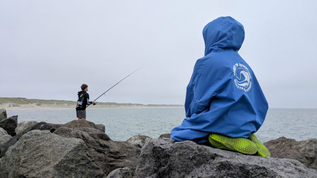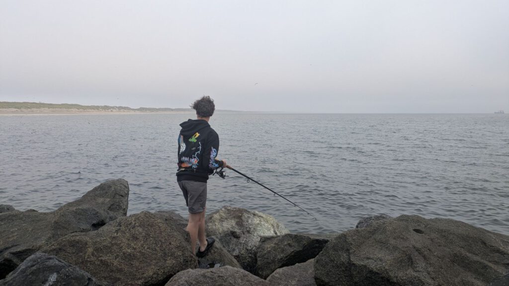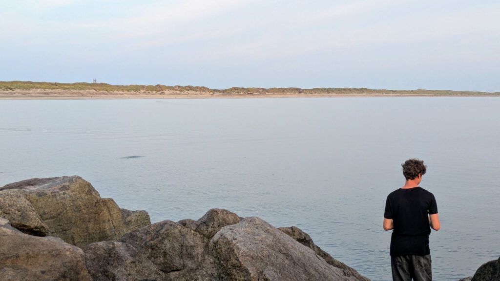 Nachdem Abendessen ging es nochmal an den Strand, erst zum buddeln und dann zum angeln. Auf der Mole tummelten sich eine Menge Angler, da es hier reichlich Makrelen gibt. Von einem netten Angler hat Iven auch das richtige Vorfach bekommen. Iven hat es lange probiert, aber leider keinen Erfolg gehabt. Manche Angler haben säckeweise Makrelen weg geschleppt. Abgesehen von menschlichen Anglern gab es auch entsprechend viele Möwen und einzelne Robben auf Fischfang zu beobachten.